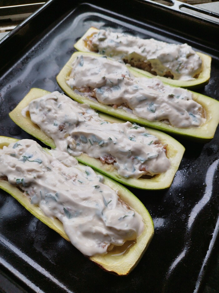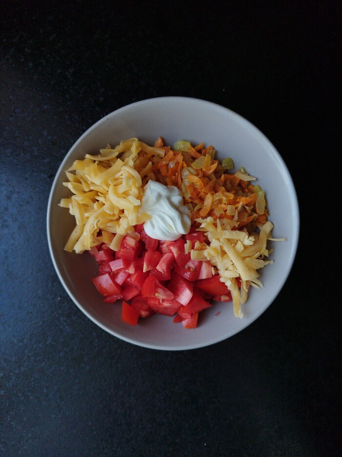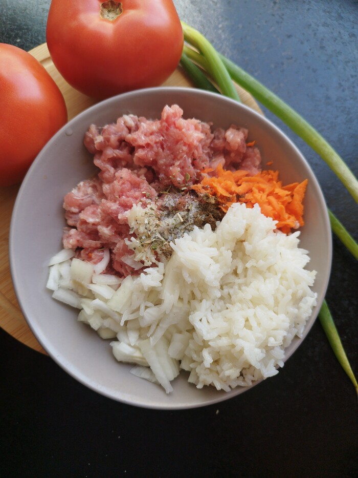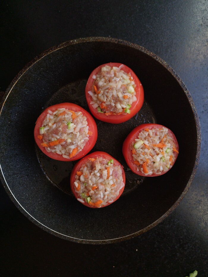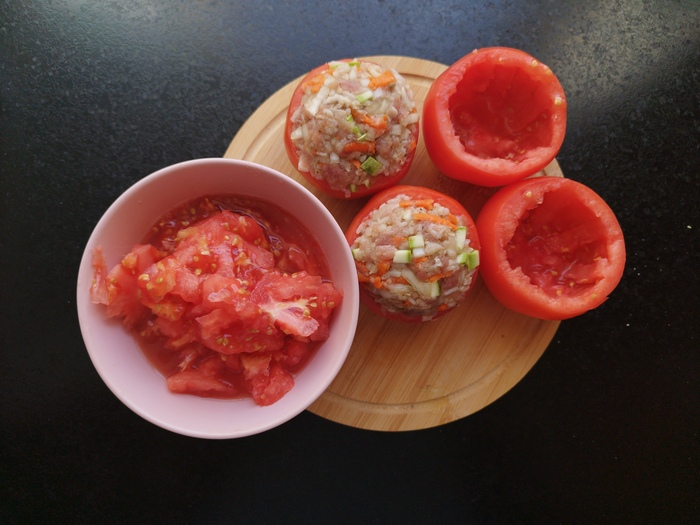 4.фаршируем помидоры. Кстати, у меня в процессе приготовления всего на свете образовались обрезки кабачка. Я их тоже зафигачила в фарш. Нечего добру пропадать