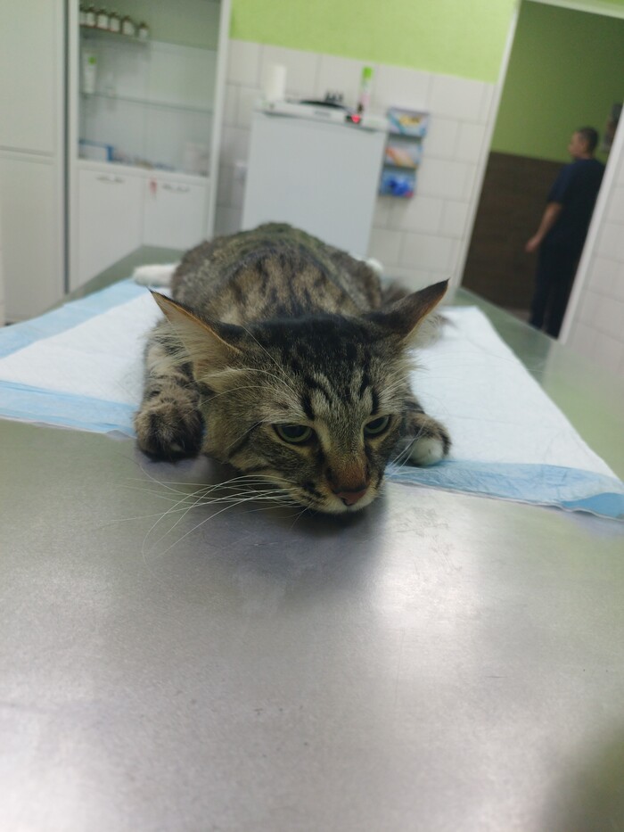 Оказалось, что нам не сняли катетер. Я поспешила, врачи замотались... Кот попытался его отгрызть. Пакую кота и мы с ним едем обратно. Вдруг он опять решил истекать кровью? Не не не! Не в мою смену!