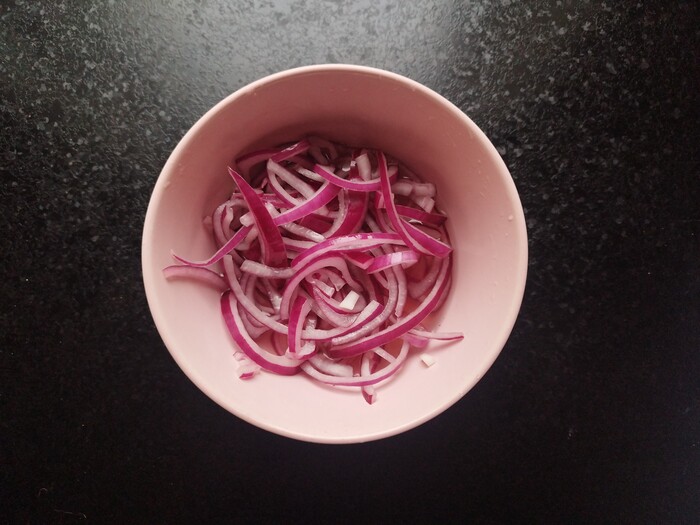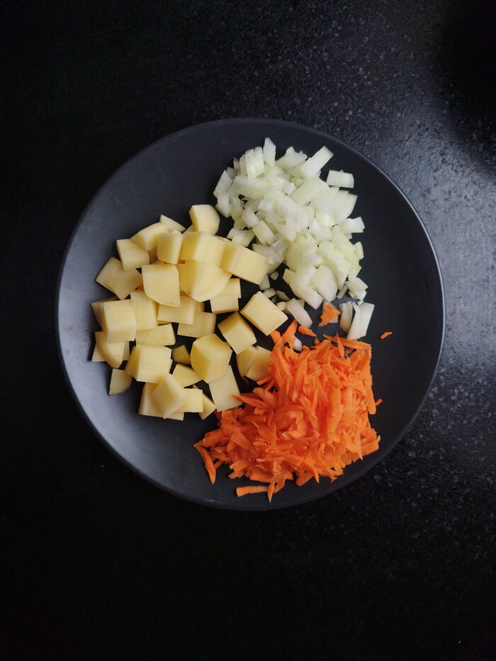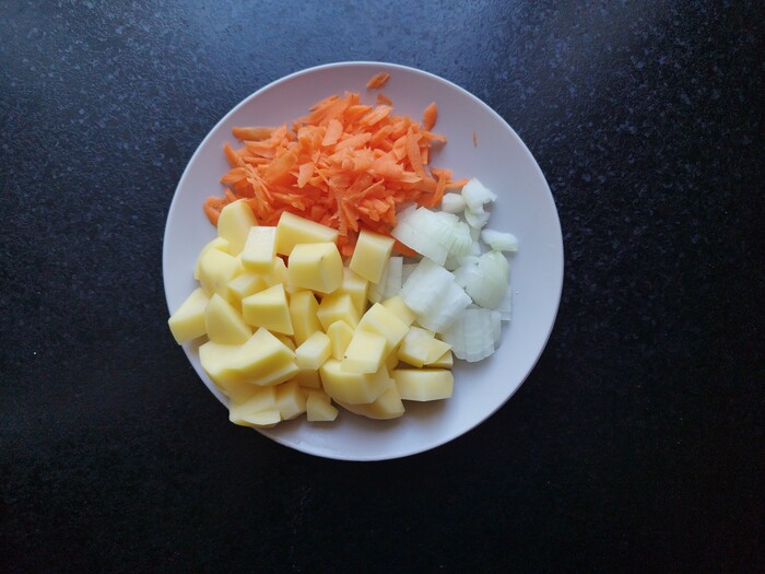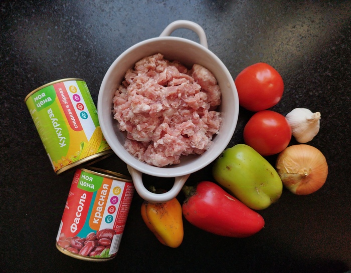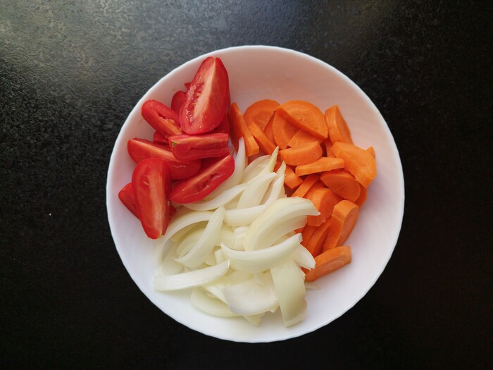 2. Все что можно нарезать - режем кубиком: лук, перец, помидоры. Чеснок (пару щубчиков) пилим как придется.