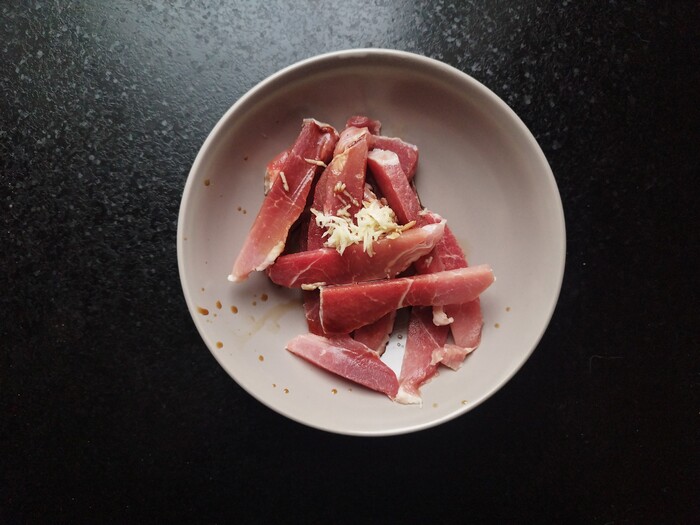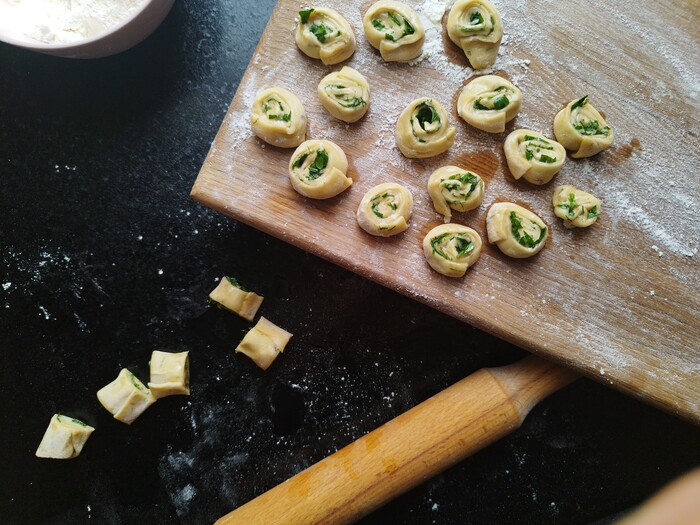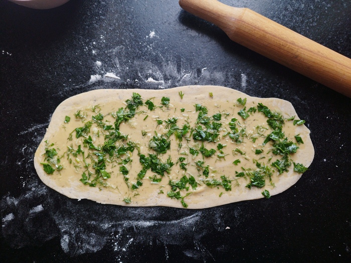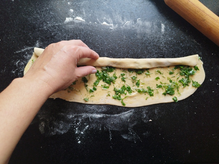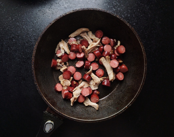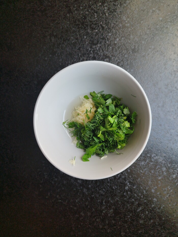 8. Перед готовностью добавляем в сковороду пару тертых зубчиков чеснока и зелень.