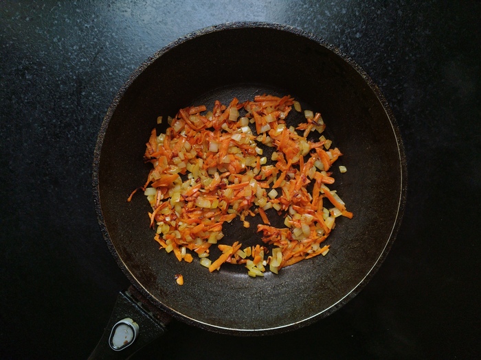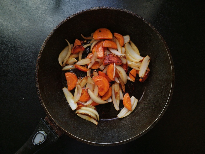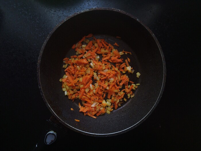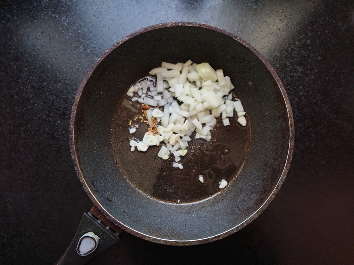 3. На небольшом количестве растительного масла обжариваем пару минут лук и нарезанный чеснок. Я добавила еще сушеный перец чили. Люблю острое)