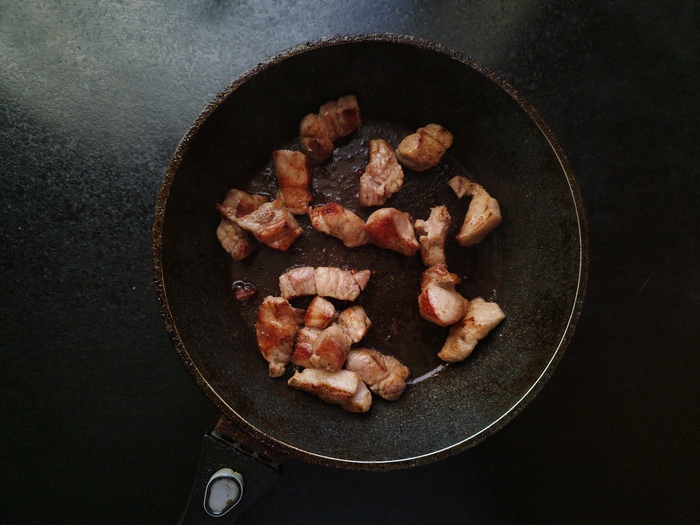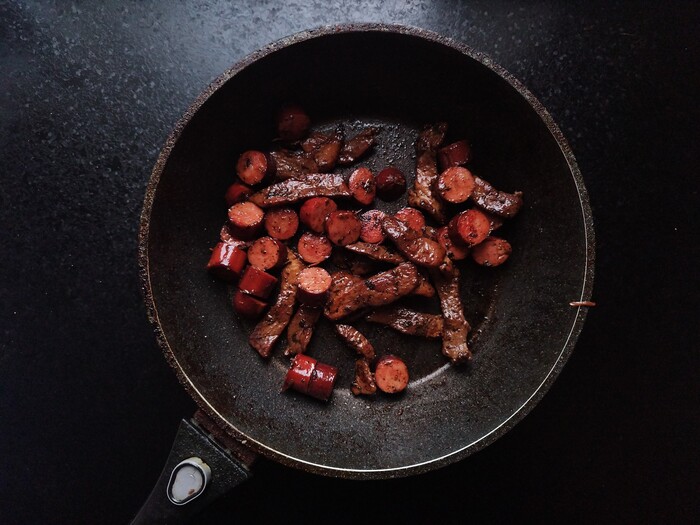 4. Закладываем фарш и обжариваем на огне чуть выше среднего, пока он не поменяет цвет.