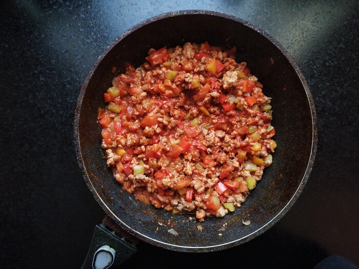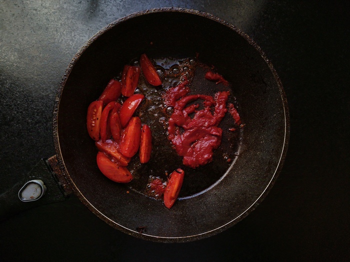 6. Добавляем помидоры, соль, перец, пару ложек томатной пасты, убираем огонь на минимум и тушим 10 мин.