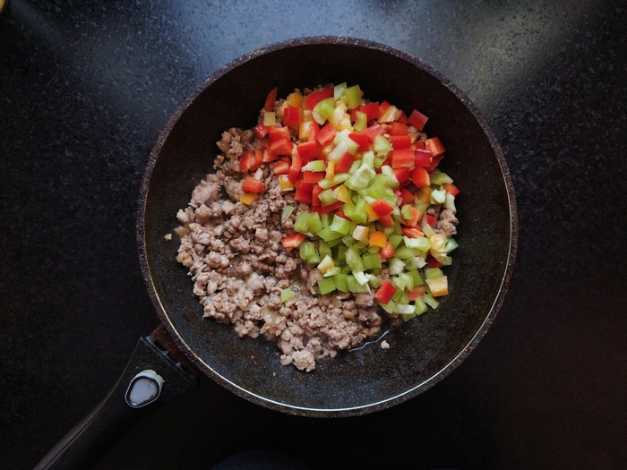 5. Добавляем к фаршу болгарский перец и продолжаем обжаривать еше минут 5.