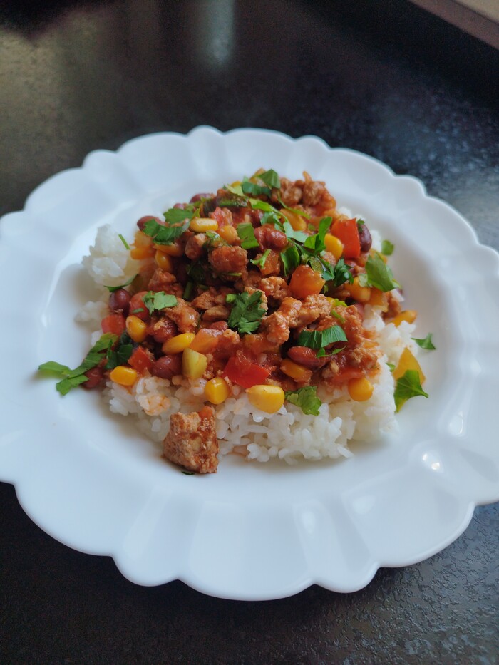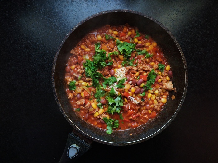 7. Пришло время кукурузы и фасоли) сливаем воду и в сковороду. Прогреваем все это дело еще минут 5.