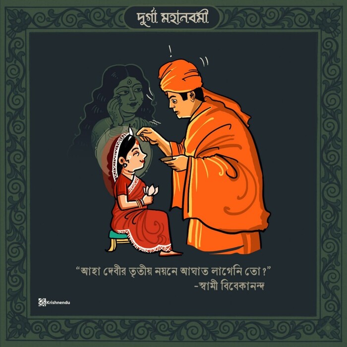 Кумари пуджа — это древняя традиция поклонения юной деве как олицетворению Шакти. Во время ритуала маленькая девочка становится живым символом чистоты, невинности и божественной мудрости. Вивекананда, следуя этому священному обычаю, показал всему миру, что духовность не знает предрассудков, а святость может проявляться в самых неожиданных формах.