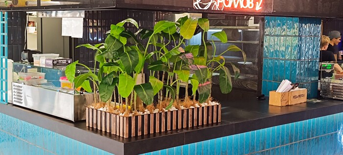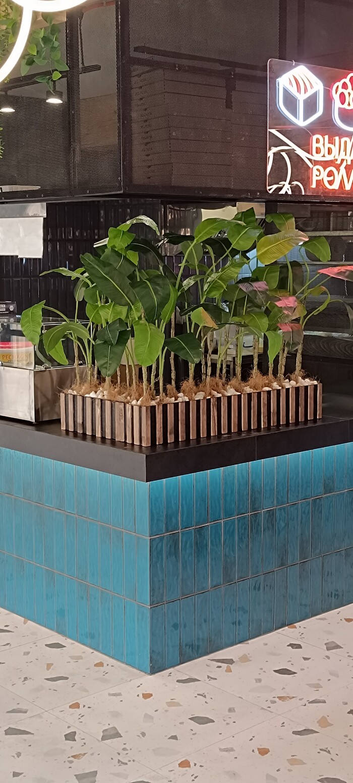 В начале осени жена сделала вот такую композицию в пиццерию. Взяла искусственную пальму премиум качества, залила ее в бетонную форму, чтобы была тяжёлой и не падала. Я ей сделал по ее проекту из фанеры короб. Покрасили в черный цвет, обшили реечками, покрыли маслом osmo.