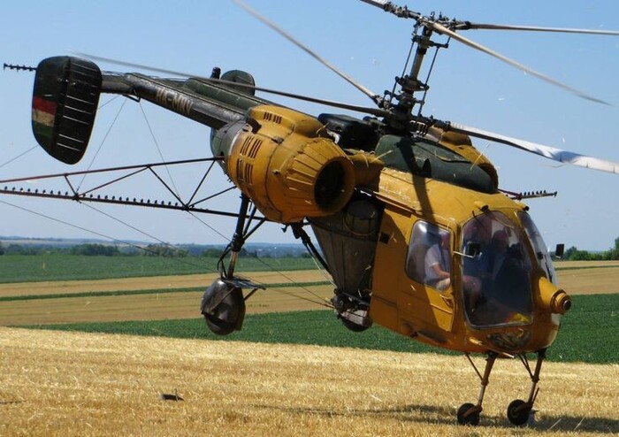 ...запуск двигателей вертолёта Ка-26ГК после 16-летнего простоя в области Ба́ранья, Венгрия... Этот сельскохозяйственный вертолёт оснащён двумя звездообразными двигателями М-14В-26 (9 цилиндров) конструкции Веденёва, мощностью по 325 лошадиных сил каждый, что в свою очередь позволяет ему развивать максимальную скорость в 115 км/ч, дальность полёта при этом составляет аж в 400км.