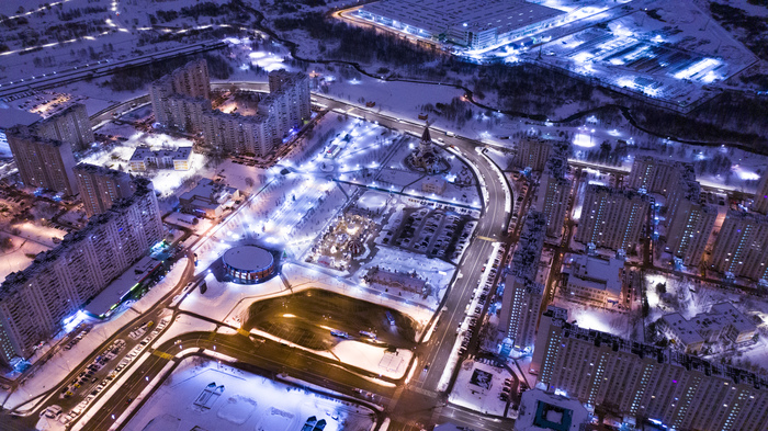Фотоаппарат на долгой выдержке в режиме "Брекетинг". Поэтому проявились следы от фонарей. Ну и сын смазан в кадре, не мог стоять без движения.