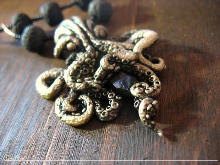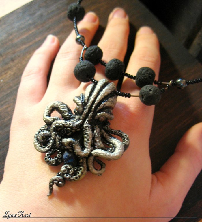Колье с рыбкой из полимерной глины и такими натуральными камнями как: зелёный агат, дымчатый кварц, зелёный апатит.