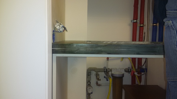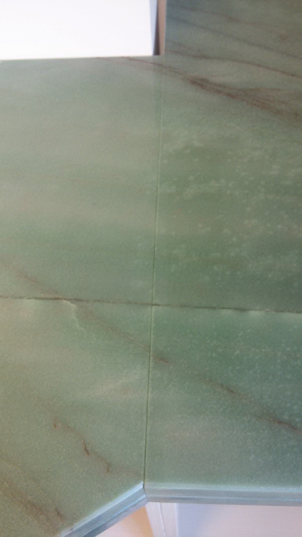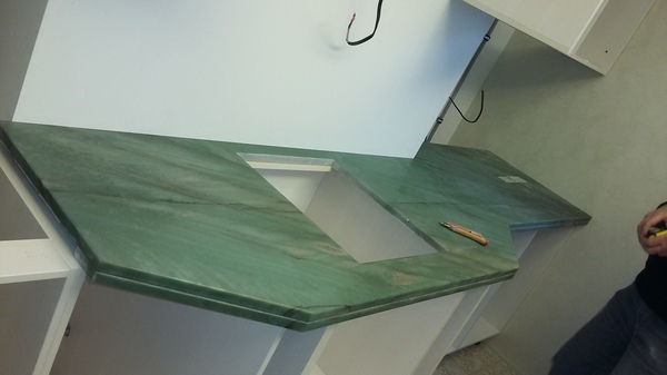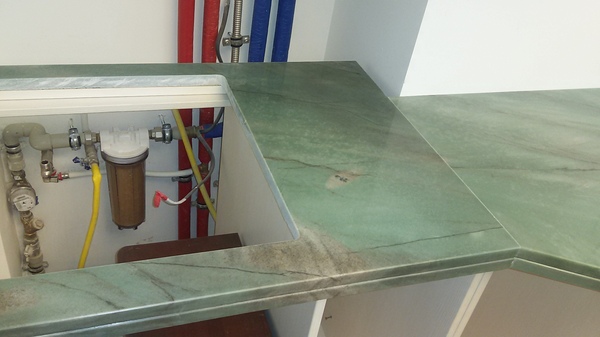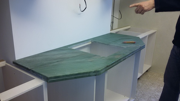 Размеров обрезков не хватило на целиковую столешницу, поэтому делаем два шва по бокам от топки. С одной стороны даже ухитрились совпасть зеленые вкрапления практически идеально по размеру и форме (но, увы, не по цвету).