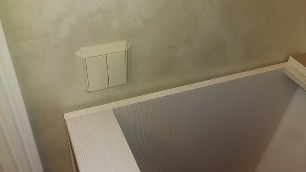 Смотрим внимательно. Расстояние от мебели до низа выключателя составляет около 35 мм. Толщина передней части столешницы - 40 мм (20 мм основная плоскость и 20 мм подклейка). Столешница просто-напросто не влезет под выключатель. Просим заказчика демонтировать выключатель, с ним будут разбираться после нашего отъезда.