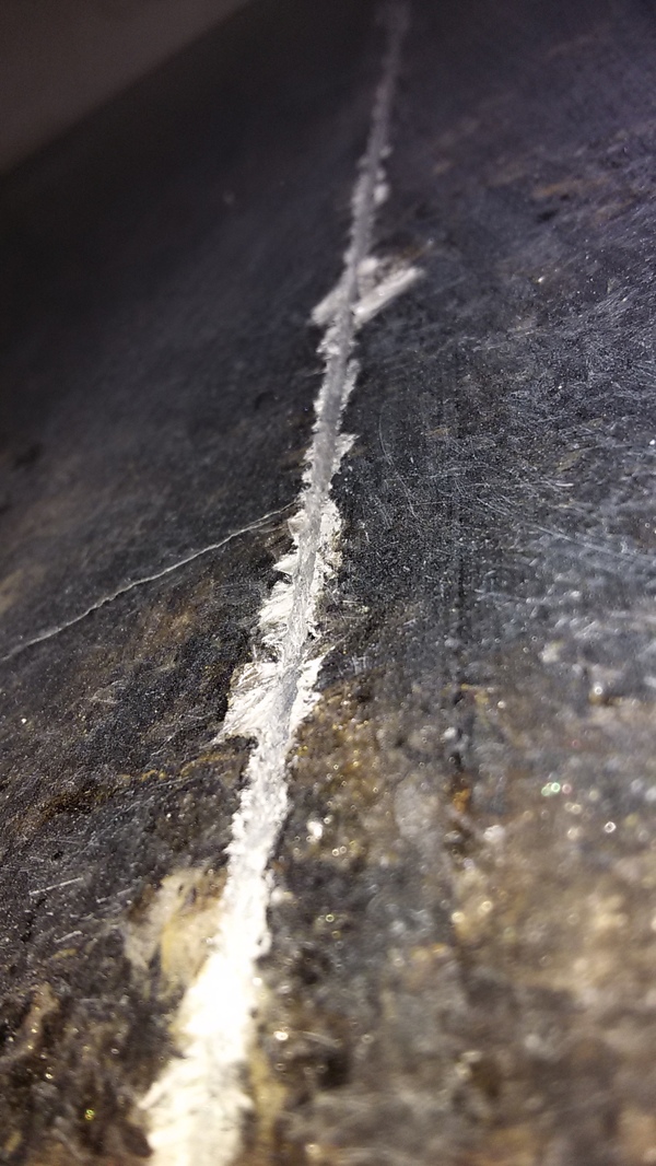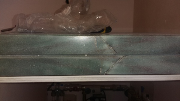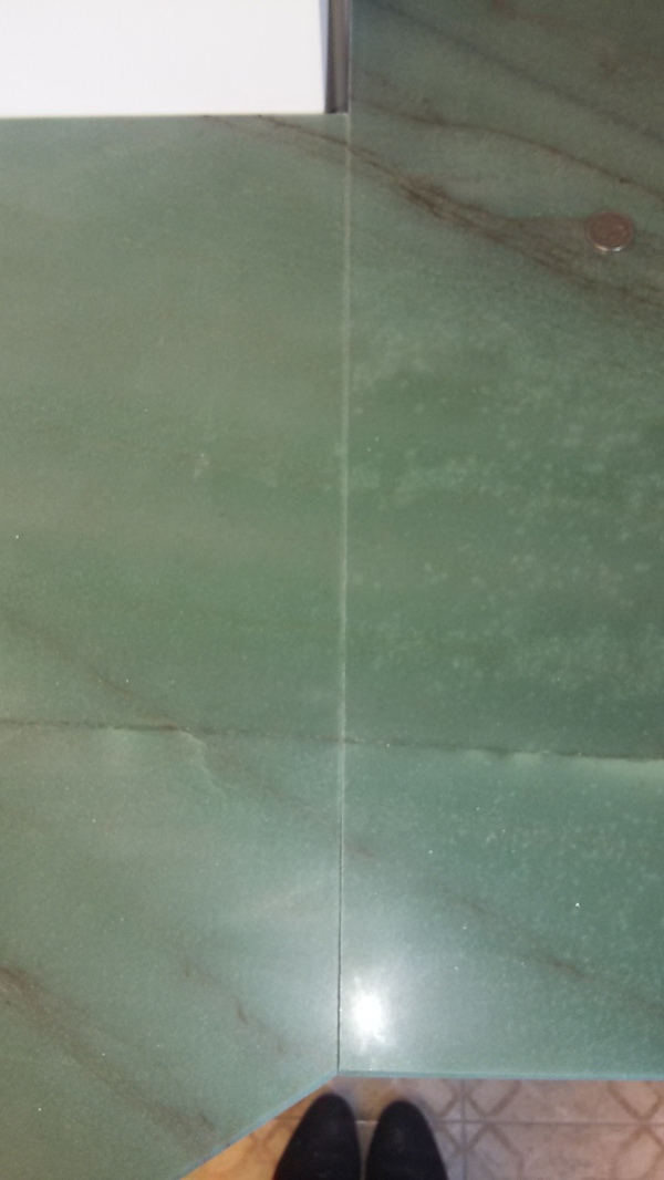 Будем мастиковать швы клеем, будет подбирать колер. И когда такая ситуация происходит на полах, это еще ничего. Но бывает, что из такого камня нужно делать фасонку - подоконники, столешницы и пр. Первое, на что мы попадаем в этой ситуации - на обработку профиля. Если заказчику приглянулась сложная обработка (а не просто полированный торец), то это значит, что профиль накатывать, мастиковать и переполировывать мы будем несколько раз - за один проход обязательно отколется часть слюды, мы это все заклеим, при втором заходе при переполировке отколется вторая часть слюды, и так далее..