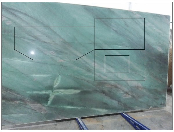 Высылаем заказчику на согласование раскрой материала, чтобы потом не было претензий, что жилы переходят не туда, не сюда и не так, как ему хотелось бы. Раскрой не в масштабе, но принципиальное расположение деталей получает одобрение у заказчика. Общая мотивация - левая деталь с вырезом под мойку располагается отдельно, так как на месте выреза можно расположить какой-либо дефект на камне (трещину, соринку, неудачный рисунок и пр.). Центральную и правую детали кроим вместе, так как правая деталь не имеет вырезов и будет выгодно смотреться переход рисунка именно на стыке с центральной деталью.