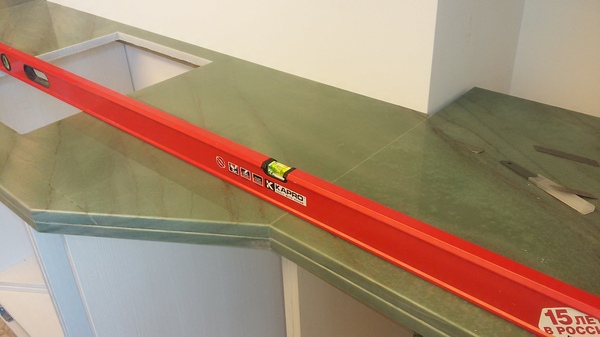 Начинаем подготовку к монтажу, проверяем степень ровности плоскости мебели. Как всегда бывает на установках столешниц, ровным бывает что-то одно - либо камень, либо мебель. Подкрутили ножки мебели под плоскость камня - швы мебели разъехались. Подкрутили ножки чтобы подровнять швы - камень начинает косорылить.