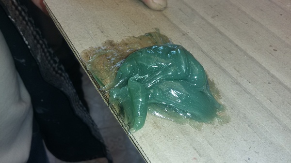 Медовый двухкомпонентный клей с зеленым и капелькой черного колерами. Кстати, колеры для каменного клея имеют бешеную пигментацию. Для колеровки количества клея, которое вы видите (ну сколько здесь, квадрат размером 7*7 см) потребовалось колера буквально 2 крупинки. Представьте себе крупинку мелкой столовой соли (именно мелкой!!!). Вот столько колера достаточно, чтобы получить насыщенный зеленый цвет.