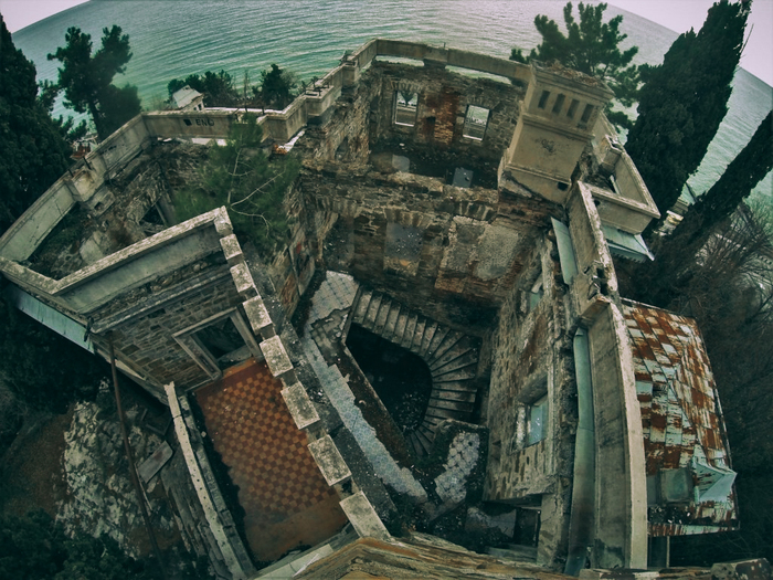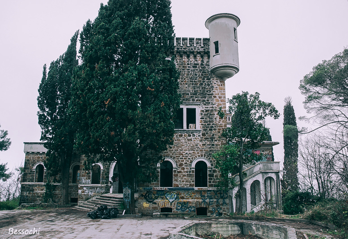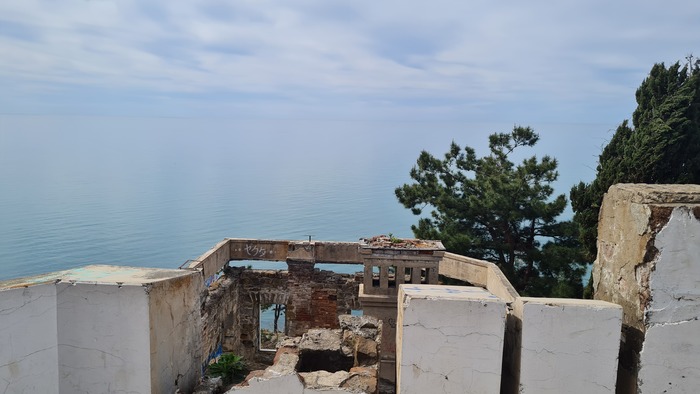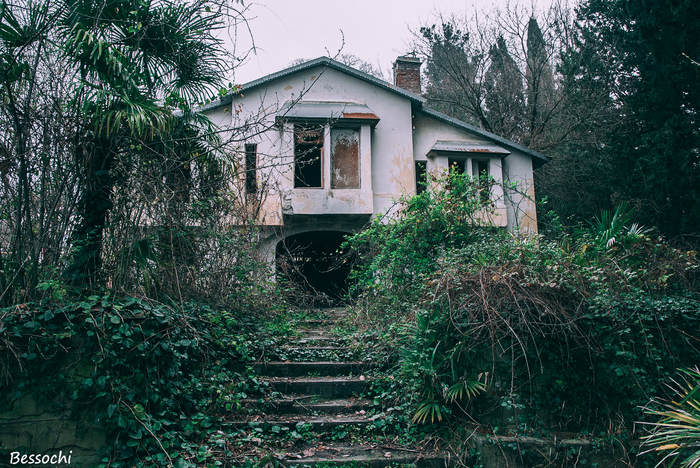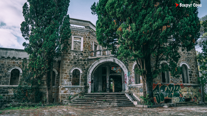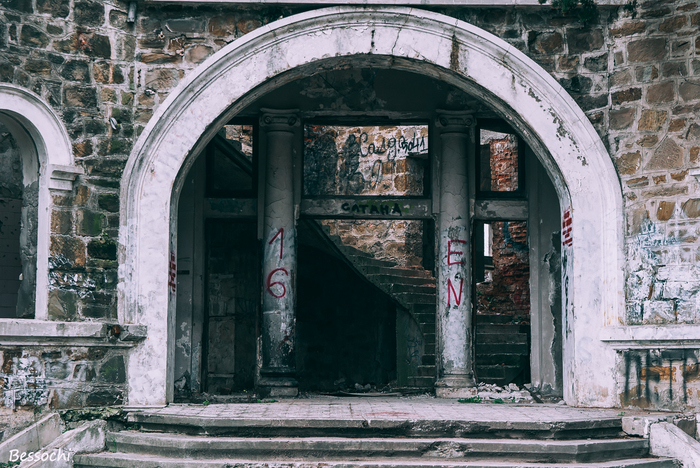 Санаторий Волна в Хосте. Громадное многоуровневое сооружение, переживает упадок. Внизу заросшие мхом ступени, аллеи, скрытые кустарником, очень заросшее умирающее сооружение. Фотографий мало, в основном беседка внизу, потом нас выгнал охранник)