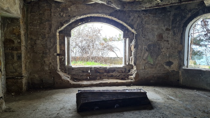 Строение конечно очень странное: Заходя в центральный вход есть разделения на вход влево и вход справа с улицы. Такое ощущение, что на две семьи было построено. Погуляли по двум этажам в "двух крыльях" ничего особого не увидели. Разве что горы шприцей, алюминиевые ложки, стаканы, кирпичи, какую то рваную одежду и старые матрацы, сразу видно, что здесь отмечали день здоровья.