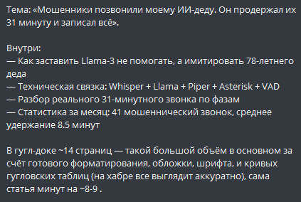 Второе: ну сама идея же зашла. ИИ-дед, который выносит мозг мошенникам — это ж круто. Социально значимо, актуально, все дела.