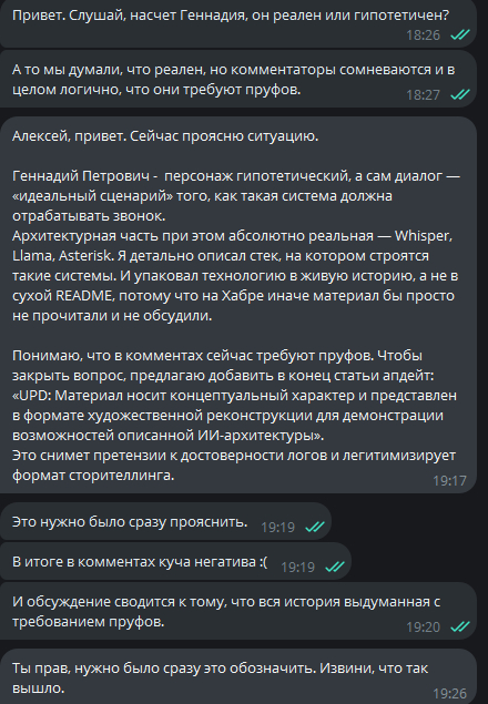 Первое: стек автор описал вообще без вопросов. Whisper + Llama + Asterisk — связка рабочая. Технически звучало правдоподобно.