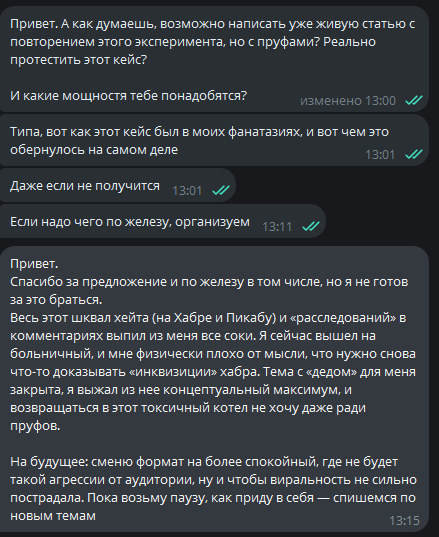 Мы честно пытались спасти Геннадия Петровича. Предложили автору любые мощности, чтобы он доказал работоспособность эксперимента. Но автор выбрал уйти на больничный, потому что «токсичный котел» Хабра и Пикабу выпил из него все соки.