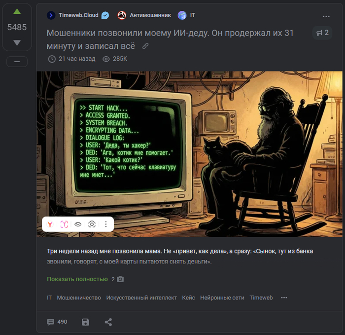 Ответ на пост «Мошенники позвонили моему ИИ-деду. Он продержал их 31 минуту и записал всё»4