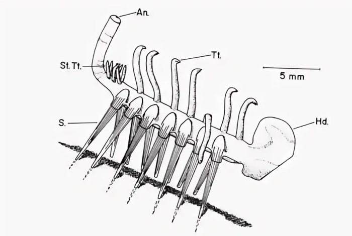 Однако вернёмся в 1886 год к Ричарду МакКоннеллу, который по своей привычке копался в отложениях чёрных сланцев [5]. Занимаясь своим любимым делом, он наткнулся на странные придатки, напоминающие мутировавших ракообразных.
