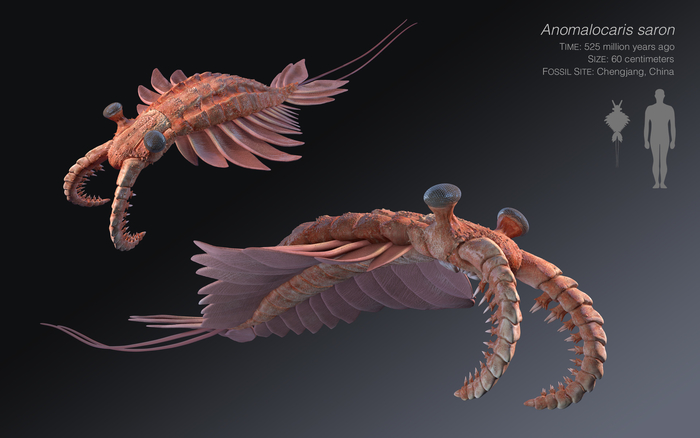 В прошлой статье про Галлюценогению я описал Аномалокариса как животное длиною приблизительно в метр [10]. Однако я опирался на вероятно устаревшие данные, ибо сейчас размеры этого монстра переоценены и считается, что наша креветка была длиной до 38 сантиметров в длину, не считая хвостового веера и передних придатков. Правда, даже с учётом и этих частей тела, членистоногое не могло достигать метра в длину [11]. Ученые, которые предполагали чересчур гигантские размеры тела Аномалокариса сравнивали разные части тела от других аномалокарин, а точнее их соотношение.