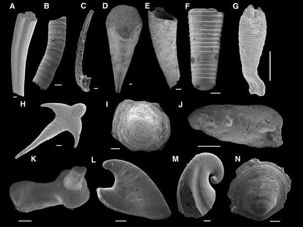 Начинается все кембрийское разнообразие с так называемой фауны мелких ракушек, массово встречающейся в начале кембрия. Эта фауна представляет собой разнообразные небольшие скелетные элементы: чешуйки, спикулы, трубочки, ракушки. В большинстве случаев непонятно, какому животному они могли бы принадлежать. Ведь многие группы животных, которые в наше время имеют монолитный скелет (например, моллюски) изначально были мягкотелыми, потом покрывались отдельными скелетными элементами (спикулами, ракушками), и только потом эти элементы срастались в единое целое (раковину).