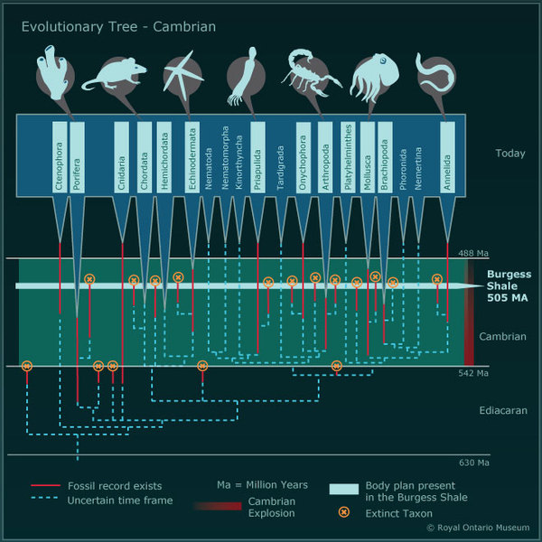 Всем снова привет! В этом посте я постараюсь рассказать об уникальном событии в истории жизни на Земле. Речь пойдет о кембрийском взрыве, или как его еще называют, кембрийской радиации. Кембрийский взрыв - это ярчайшее событие в палеонтологической летописи планеты, когда за относительно небольшой срок (несколько десятков миллионов лет) происходит резкое увеличение количества ископаемых останков живых существ и, на первый взгляд как бы из ниоткуда, появляются почти все современные типы животных (хордовые, членистоногие, моллюски, иглокожие и тд).