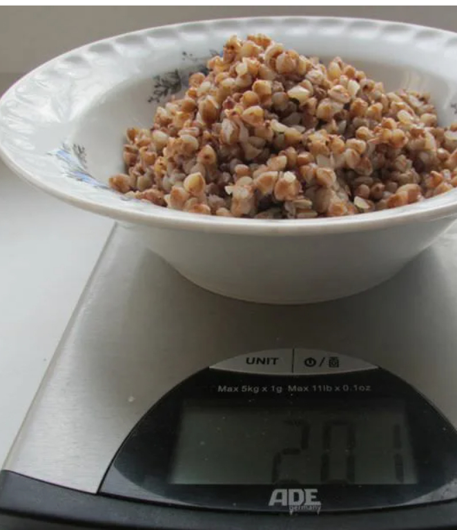 Приблизительно так выглядит порция из 80 грамм гречки сухой смеси после приготовления: