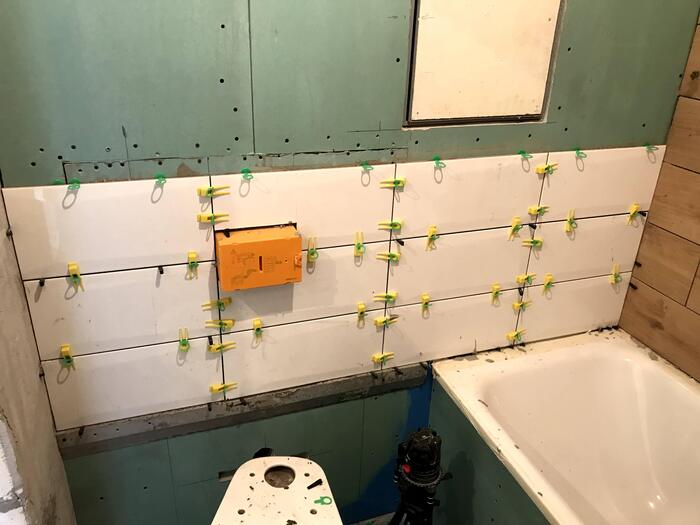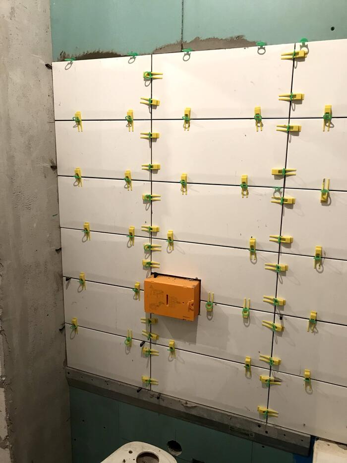 Итак, настало время плиточных работ. Сам это никогда не делал, поэтому было пересмотрено куча видео на ютубе и вроде схема в голове сложилась. Решил использовать СВП, класть плитку на гребёнку, все стены хорошо прогрунтованы перед этим.