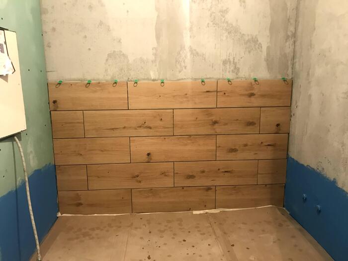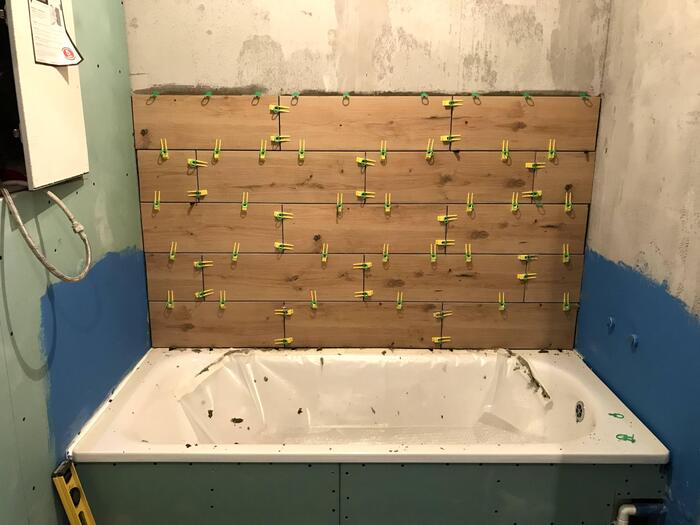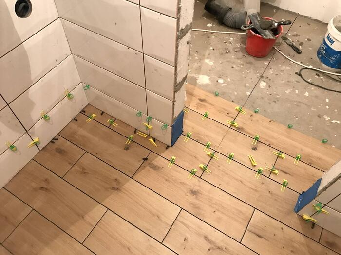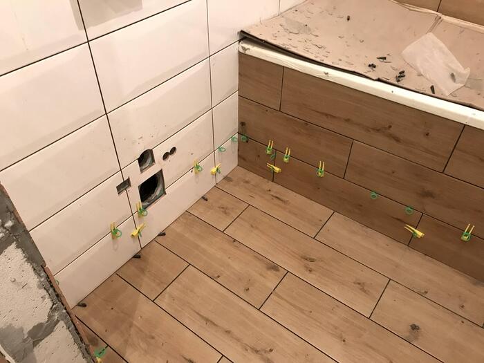 Итак, поехали, стартанул от установленной ванной. Сначала погнал керамогранит под дерево, отравнял по центру - получилось минимум обрезков и хорошие не мелкие подрезки по краям.