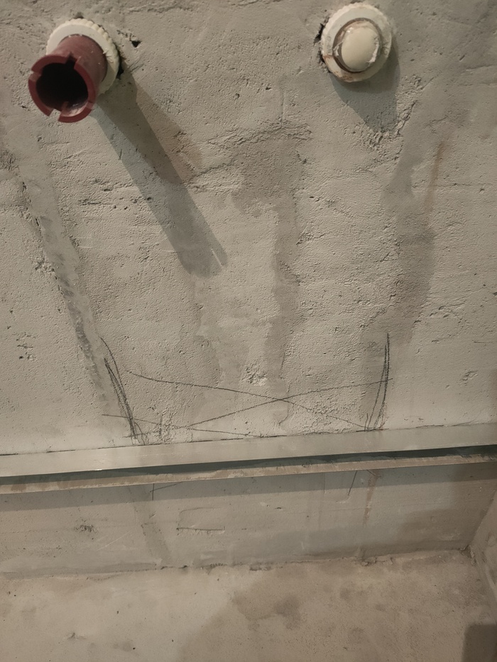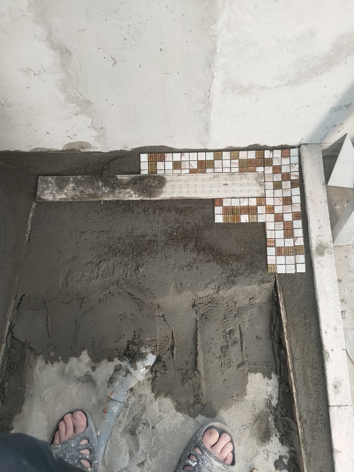 На следующий день,когда трап и труба уже схватились в смеси намертво,мы с заказчиком,вдвоем,только, блеать ,увидели что там колено сотки торчит из под перегородки(на фото видно)и довольно высоко.Трап уже не поднять,и придется подымать пол в поддоне.Высшая точка конечно,верх колена,и от него я разметил и выпилил проем в перегородке