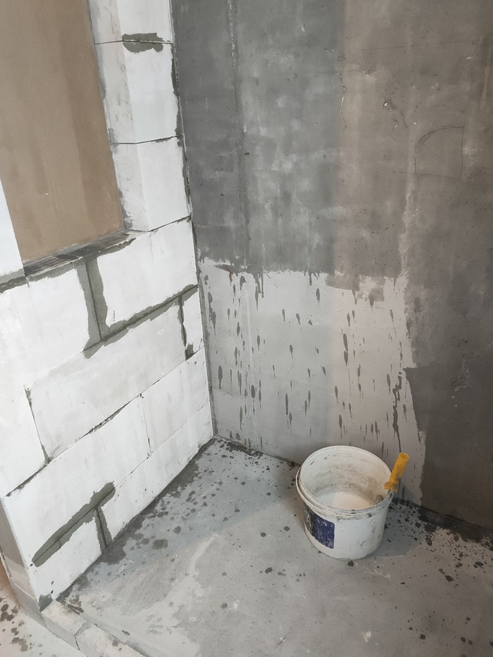 После полного высыхания грунтовки наношу гидроизоляцию на стены душевой зоны