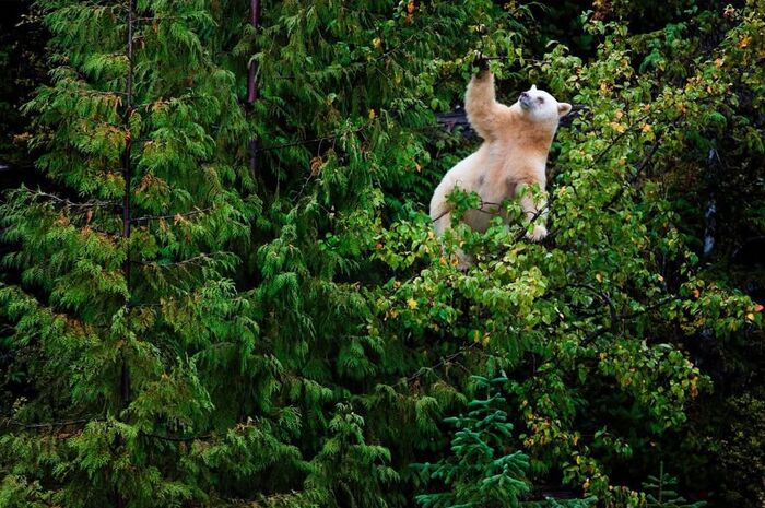 Местные индейцы называют этого медведя «призрачным». Среди буйствующей зелени светлый силуэт действительно выглядит паранормально.