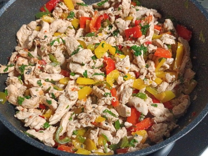 Разогрейте гриль или сковороду гриль и обжарьте куриное филе. Дайте отдохнуть 5 минут и нарежьте.