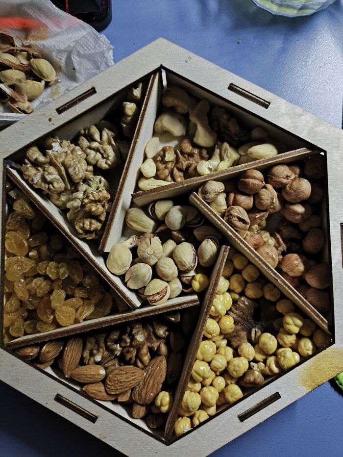 К сожалению, по мере опустошения, стало понятно, что на дне упаковки в каждом отсеке грецкие орехи.