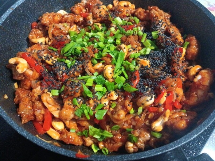 Добавьте курицу, кешью и перемешайте. Посыпьте зеленым луком и кунжутом.