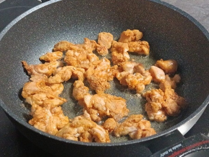 В миске смешайте ингредиенты для панировки и пересыпьте в пакет для заморозки. Достаньте курицу из маринада, промокните бумажными полотенцами и положите в пакет с панировкой. Встряхивайте пакет, пока курица не покроется панировочной смесью. В сковороде на сильном огне нагрейте 45 гр. растительного масла и обжарьте порциями курицу, 4-5 минут, перевернув один раз. Выложите на бумажные полотенца.
