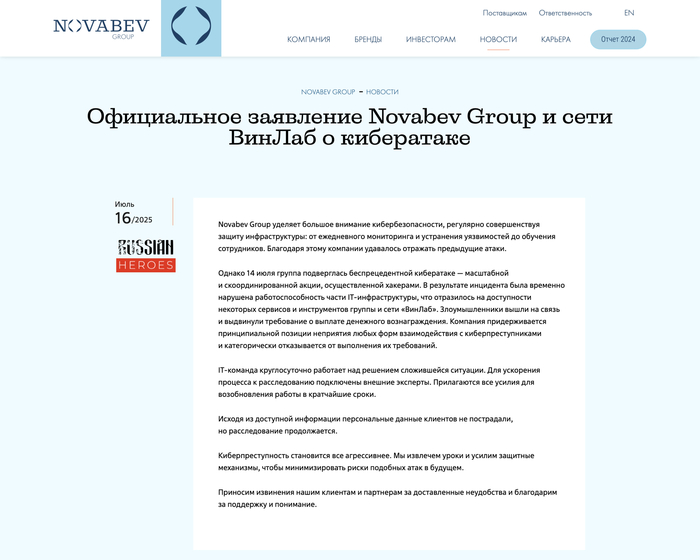 Атака была стремительной и жестокой. Злоумышленники взломали инфраструктуру «Novabev Group», к которой относится «Винлаб», и потребовали выкуп. Компания сразу отказалась от ведения переговоров с кибертеррористами, заявив о принципиальной позиции. Два дня о взломе молчали, на магазинах были таблички о закрытии по техническим причинам. Лишь 16 июля Novabev Group официально признала массовый сбой. Известно лишь, что часть сервисов отключена, а ИТ-специалисты работают в авральном режиме, пытаясь восстановить систему.