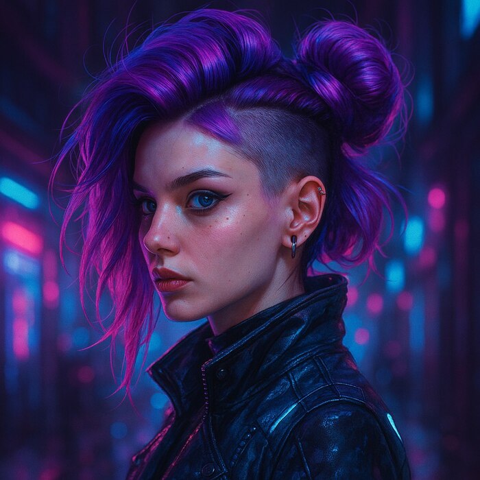 Generate a portrait of a girl in cyberpunk style, make an unusual hairstyle, purple hair, use blue, pink and blue colors
