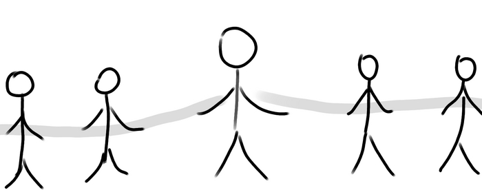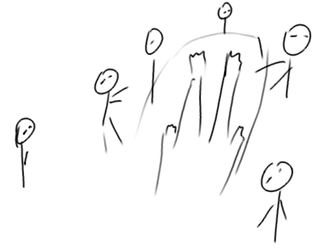 Из рук в обе стороны изобразили «провода», которые «проходят» через других людей.
