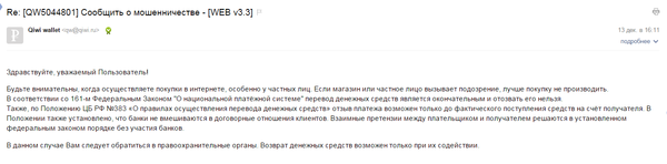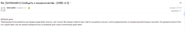 В ответном письме я им написал, что кошелек QIWI на который я переводил деньги - украинский, и местные органы наверняка ничего поделать не смогут. Так же поблагодарил QIWI за то что "помогают" мне, и я крайне разочарован их сервисом. Сегодня утром они прислали еще одно сообщение: