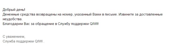 14 числа сего месяца, проснувшись с утра, я счел необходимым пополнить свой электронный кошелек в системе qiwi. Идти в ближайший салон "Связного" желания не было, поэтому я отправился к ближайшему терминалу qiwi, который в свою очередь не выдавал чеков, но выводил на экран после оплаты "электронный чек" (что меня и спасло, потому что в моем распоряжении оказались все данные платежа). Успешно пополнив "свой" qiwi кошелек, я с чистой совестью пошагал домой. Зайдя в личный кабинет qiwi кошелька я обнаружил, что мой баланс равен "0". Подождав некоторое время, я понял, что что-то не так и решил проверить пополненные мною реквизиты, достал телефон, на который я успешно сфотографировал как раз тот самый «электронный чек». Обнаружив то, что мною была допущена ошибка в наборе номера, я тут же зашел на официальный сайт-->помощь-->при оплате допущена ошибка в реквизитах-->«служба поддержки QIWI», заполнил все поля, кроме «скриншот или скан чека» по понятным причинам. Проделав данный алгоритм действий, я не успокоился и стал искать отзывы людей, которые сталкивались с похожей ситуацией. Тем временем мне на почту пришло извещения от qiwi о том, что мой запрос зарегистрирован под ***** номером. Но это меня мало успокаивало, потому что, как люди писали на форумах, это было скорее всего последнее сообщение от qiwi. Не имея чека я понимал, что что-то доказать будет сложно, поэтому я решил, что нужно исправлять ситуацию. И на следующий день я решил написать «вручную» на почту claim@osmp.ru, с просьбой выслать мне на почту чек. Ответ пришел моментальный, с просьбой подождать 2 рабочих дня. 17 числа мне пришло долгожданное сообщение с вложением моего чека об оплате «не моего» qiwi кошелька.