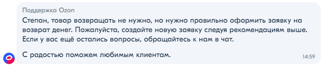 Я уже просто нервно ржу - переписыватся с воскресенья до пятницы в попытках вернуть товар и деньги? Когда любая нормальная фирма делает это по щелчку пальцев. Но порадовало больше другое в финале от озона.