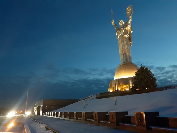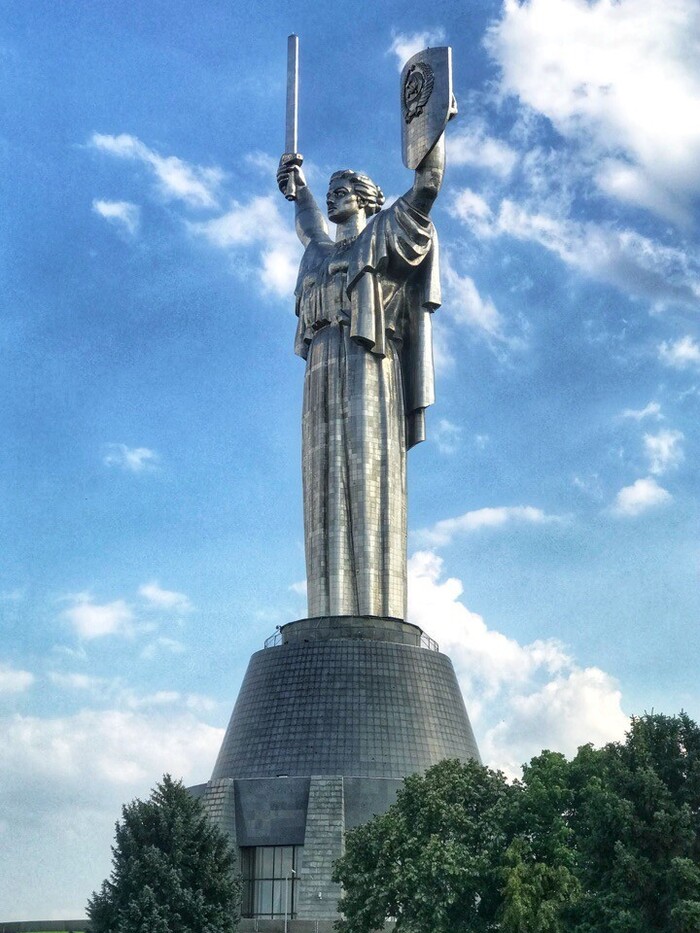 Монументальная скульптура "Родина-мать" расположена на правом берегу Днепра. Она была открыта на торжествах по случаю Дня Победы в 1981 году. Памятник считается самым высоким в Европе - высота с постаментом достигает 102 м. Монумент представляет собой статую женщины, которая в одной руке держит меч, в другой - щит с гербом СССР. Над проектом работал советский скульптор Евгений Вучетич.