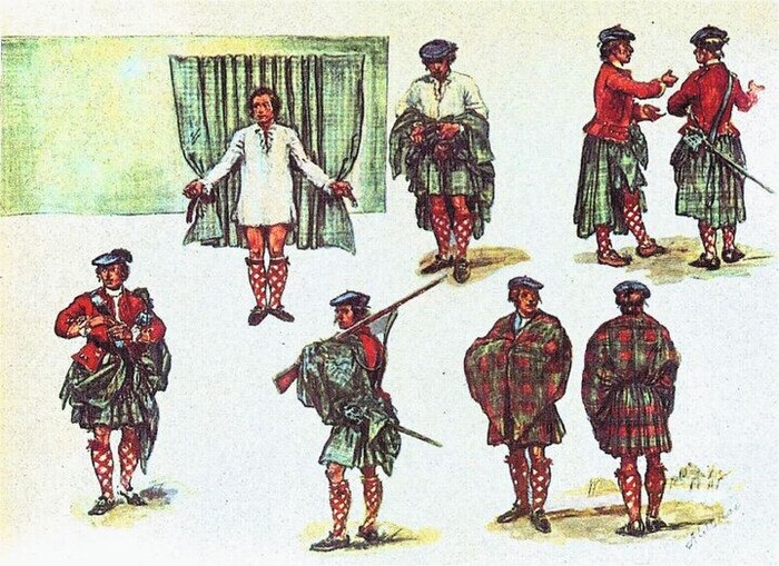 Многие называют килт «юбкой», это неправильно. По сути, это был всё тот же самый «колокол с разрезом»: прямоугольный длинный большой плащ из толстой шерстяной ткани, обёрнутый вокруг тела и перепоясанный ремнём. (Кстати, шотландское слово «килт» и переводится как «заворачиваться, обёртывать».)