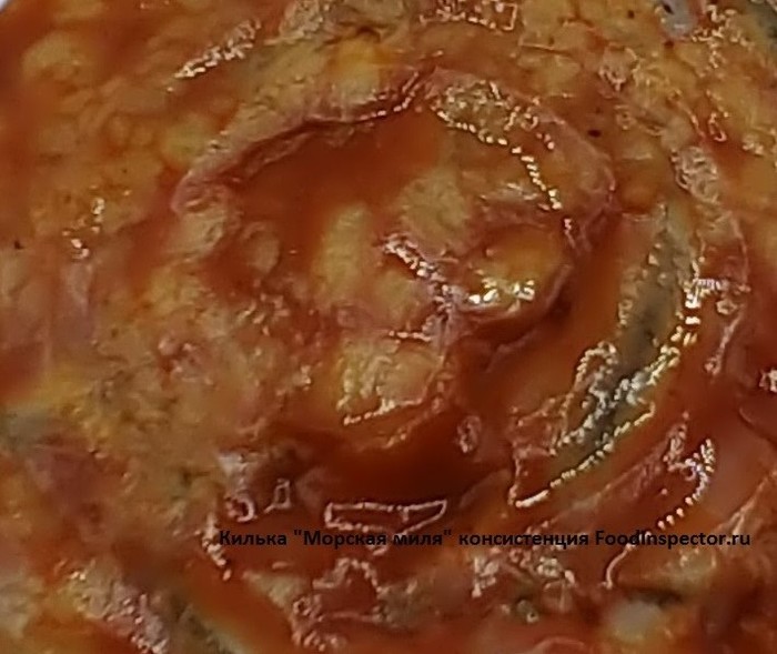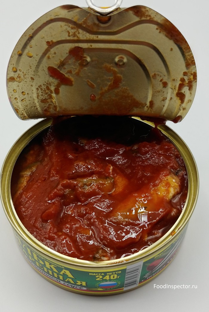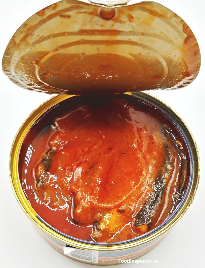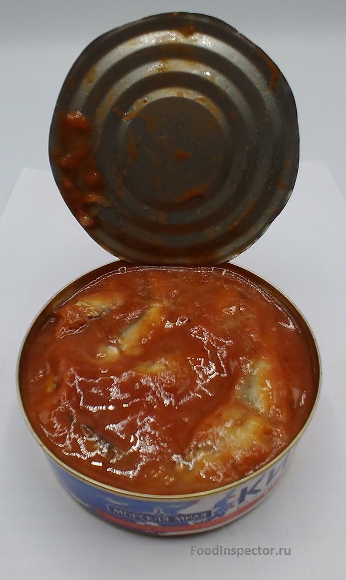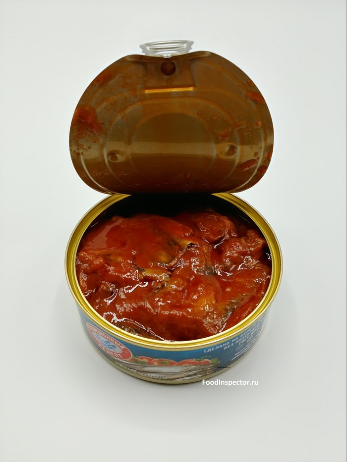 Начинаю открывать, чувствую сильный, рыбно - томатный, запах. Открываю банку, заглядываю внутрь.