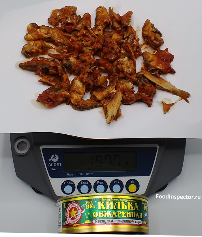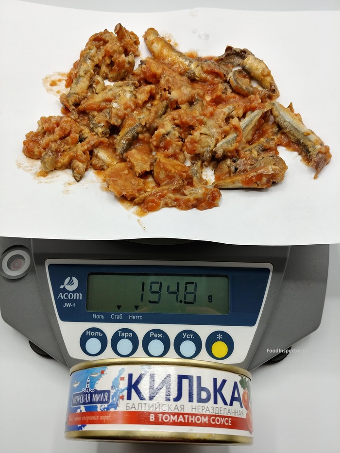 Получаю 56,8 гр. Разница составляет фактический вес нетто – 247,7 гр. Это на 17,7 гр. больше веса нетто, заявленного на банке – 230 гр. Посмотрим за счет чего получился излишек веса нетто: из за рыбы или соуса?